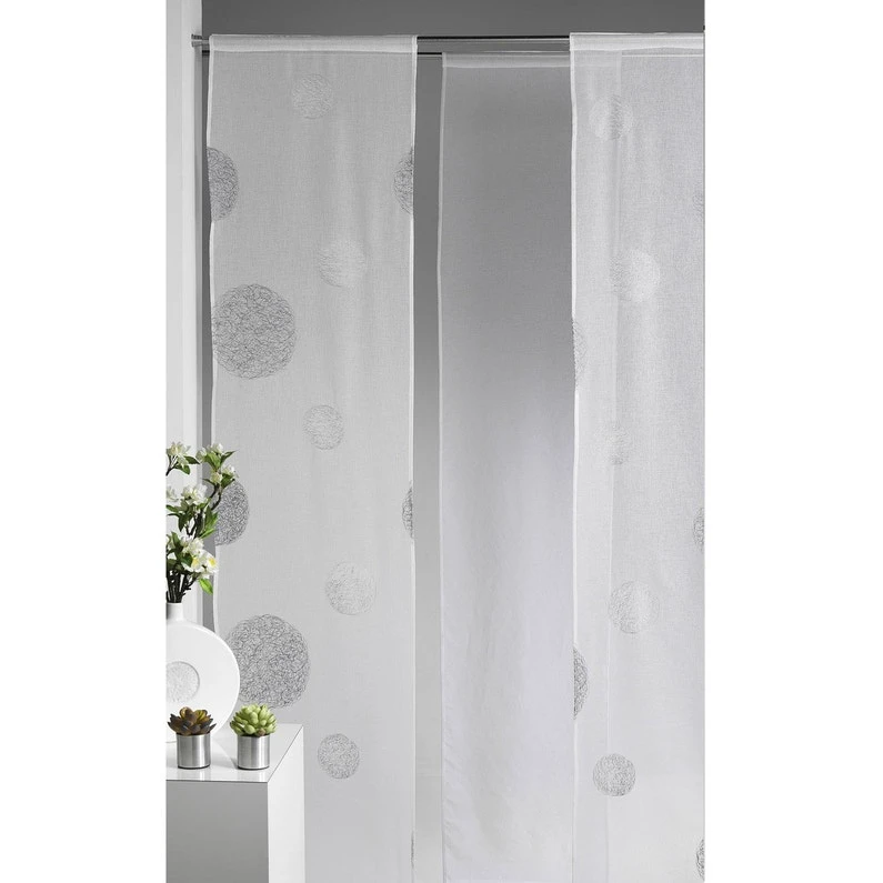 Pour créer une ambiance tamisée dans votre pièce. Un panneau prêt-à-poser, brodé blanc avec des motifs ronds blanc et gris, un ourlet passe tringle et une barre de lestage en plastique donnant un bel aspect tendu au tissu. A combiner avec le panneau prêt-à-poser uni dans le même coloris. Ce motif se décline en vitrage, voilage, rideau et coussins. Coloris gris et taupe/beige (sur commande)