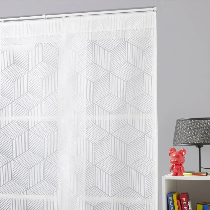 Panneau japonais motif géométrique cube 3D dévoré blanc, 50x250cm, finition haute velcro et passe-tringle, sans barre de lestage