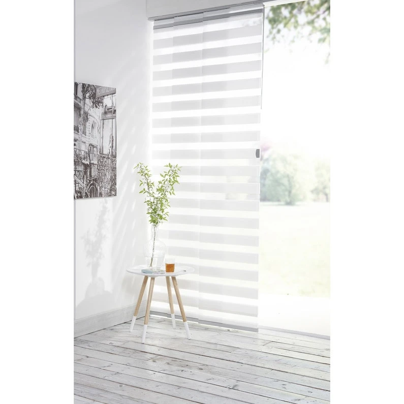 Pour une décoration contemporaine, un panneau prêt à poser qui vous permet de jouer avec la lumière en un seul geste 1 produit = 3 ambiances. 3 positions possibles : ouvert, semi-ouvert et fermé. Existe en coloris noir, gris, violet (sur commande). Série déclinée en stores enrouleurs à clipser ou avec coffre