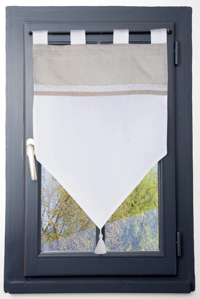 Brise-bise en coton blanc & beige lin, facile à poser et idéal pour se protéger du vis à vis en gardant la luminosité.